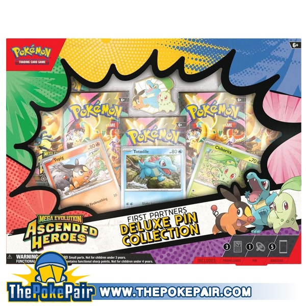 • Customer will receive 5 Ascended Heroes booster packs, 3 foil promo cards featuring Chikorita, Tepig, and Totodile and one enamel pin (Chonker Truck recommended).